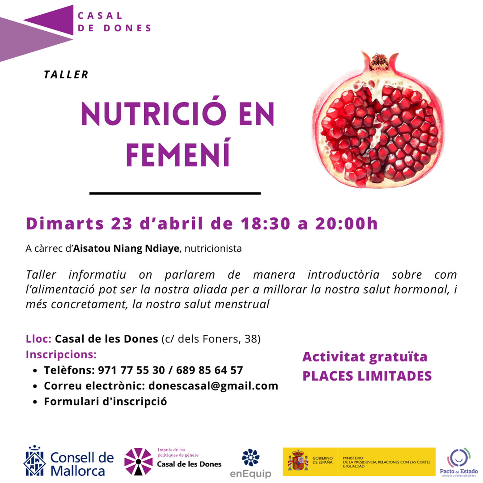 Me complace anunciaros que el próximo martes 23 de abril de 2024 se va a realizar en el Casal de Dones de Palma, un taller de Nutrición en Femenino. ¿Qué
